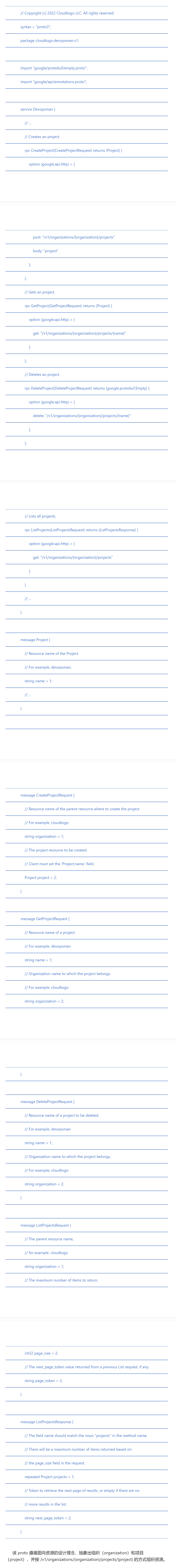 该 proto 遵循面向资源的设计理念,抽象出组织(organization)和项目(project),并按 /v1/organizations/{organization}/projects/{project} 的方式组织资源。