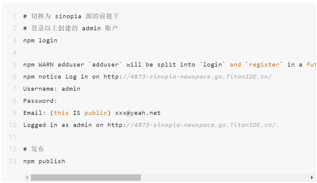 这时你的开发组成员就可以使用这个源地址去拉取推送这些 npm 包了,这里先对源进行设置。