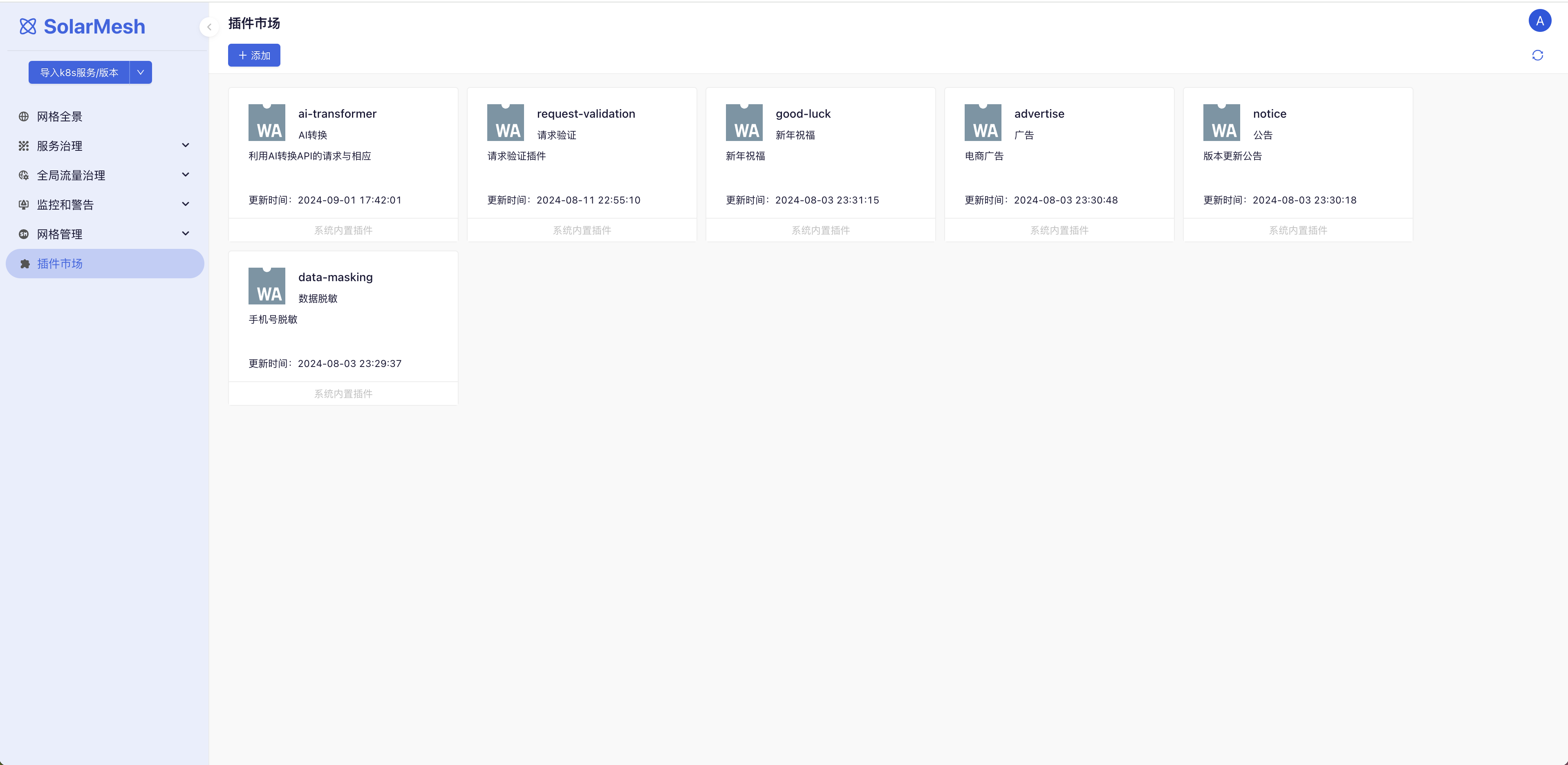 首先前往插件市场,这里有SolarMesh以及内置好的插件,如ai-transformer、request-validation等。