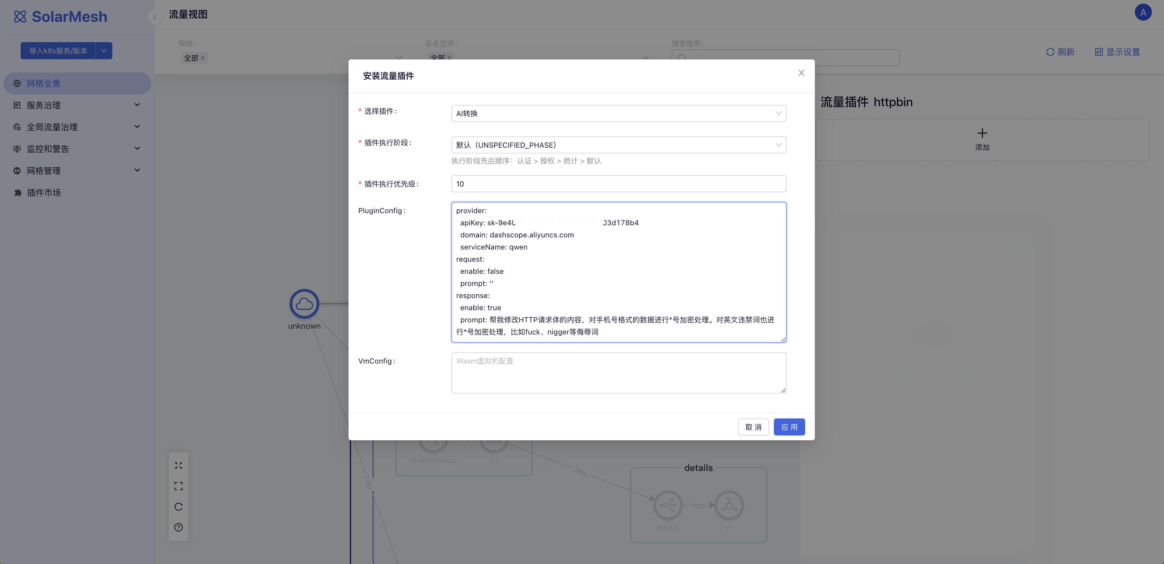 • 在流量视图中,选择需要应用插件的服务,并填写相关参数,包括插件执行阶段、执行优先级、PluginConfig 和 VmConfig。