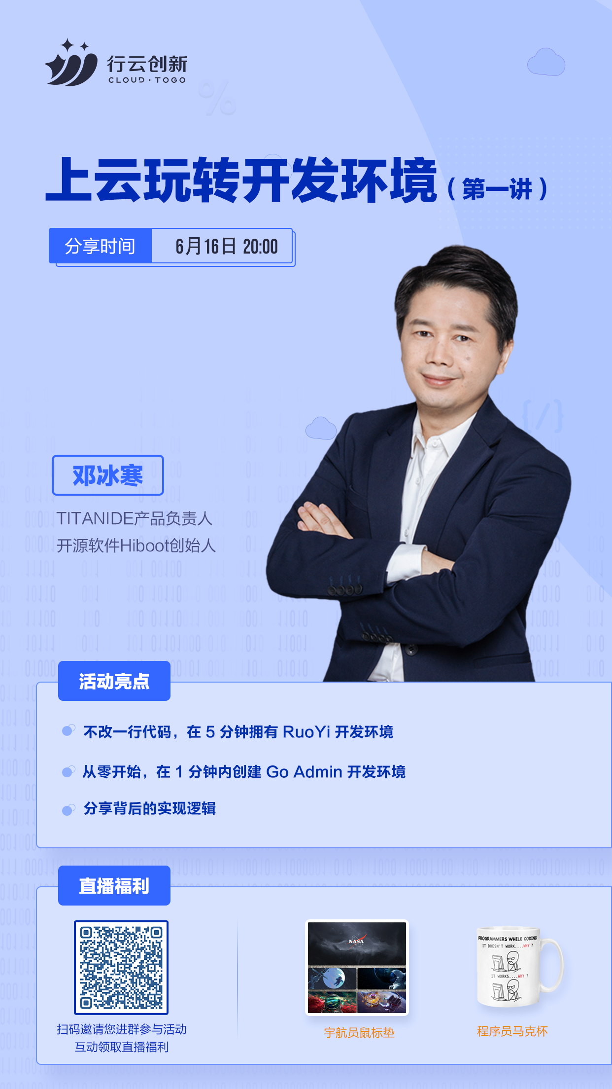 6月16日20:00,“上云玩转开发环境”第一讲即将开启!NG28创新 TitanIDE 产品负责人邓冰寒将分享:如何利用 TitanIDE 在不改一行代码情况下,在5分钟拥有 RuoYi 开发环境;如何从零开始,在1分钟内创建 Go Admin 开发环境;以及分享这背后的实现逻辑。直播间还会送出宇航员鼠标垫、程序员马克杯等福利,快扫码参与活动吧~